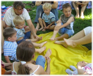 Draussen unter dem schönen alten Baum versammelten wir uns. Ca. 10 Kinder von 1-4 Jahren zusammen mit ihren Eltern waren gekommen. Alle hatten sie ein kleines Gerät in ihrem Ohr. Ganz bunt waren diese kleinen Geräte. Aber - sie sind ein kleines Wunder der Technik. Waren früher diese Kinder dazu verdammt, gehörlos und damit auch mit enormen Sprachschwierigkeiten aufzuwachsen, so ist durch dieses kleine technische Wundergerät allenfalls eine kleine Entwicklungsverschiebung gegeben. Auffällig war die Aufmerksamkeit, die die Kinder und auch ihre Eltern den Klängen entgegen brachten. Wir haben zusammen gesungen und die Lieder mit vielen einfachen Gesten begleitet. Mit den Rasseln gespielt und massiert. Sie konnten die Gesten der Lieder schnell umsetzten, sie hatten sofort einen Zugang zu den Instrumenten. Die natürliche Neugier stand bei allen im Vordergrund und liess Eltern und Kinder ausprobieren. So gaben schon die Kleinsten den Mamas und Papas Klangmassagen, stellten sich in die große Fußschale und konnten erleben, wie viel Freude die Arbeit mit den Klängen macht.